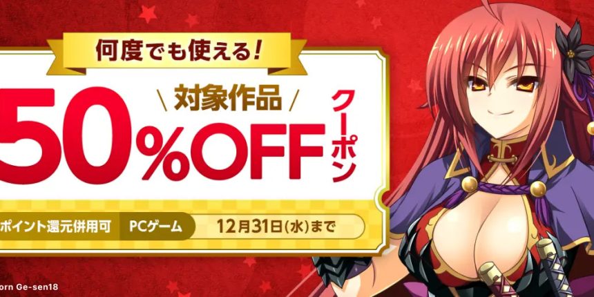 対象タイトルはなんと999本! 何度でも使える50%OFFクーポンが配布中! ポイント還元も併用可能…