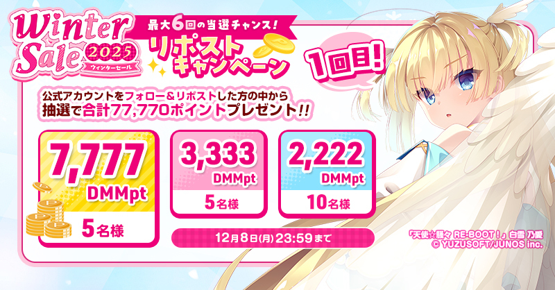 概要:公式Xアカウントをフォロー&リポストしたユーザーの中から、抽選で合計DMMポイント77,770ポイントをプレゼント!最大6回の応募チャンスがあり、第1回目の応募期間は11月27日(木)から12月8日(月)です。ぜひ奮ってご参加ください。