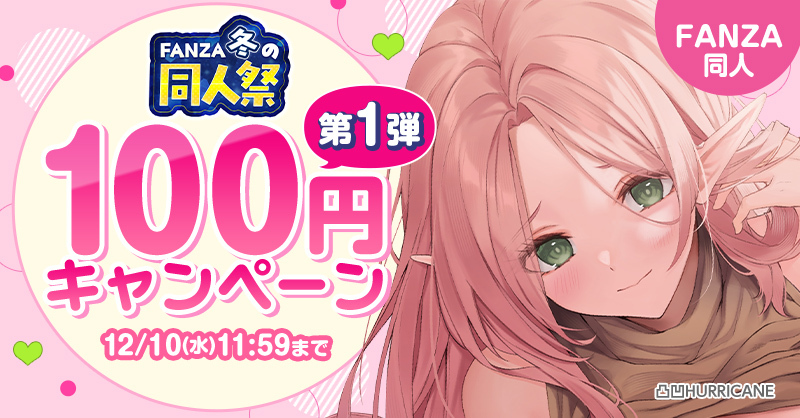 対象の人気作品を一律100円で購入できる「100円キャンペーン」を開催いたします。対象作品のラインナップは期間ごとに更新予定で、各回で異なる作品をお楽しみいただけます。FANZA同人をさらにお得に楽しめるこのキャンペーンを、ぜひお見逃しなく!