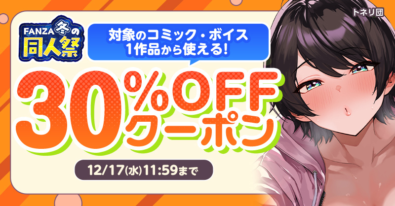 期間中、男性向け作品を対象とした20%OFFクーポンを配布いたします。さらに、一部コミック・ボイス作品を30%OFFで購入できる限定クーポンも配布予定です。いずれも期間中は何度でも1作品からご利用可能です。お得に作品を手に入れられるこの機会を、ぜひご活用ください。