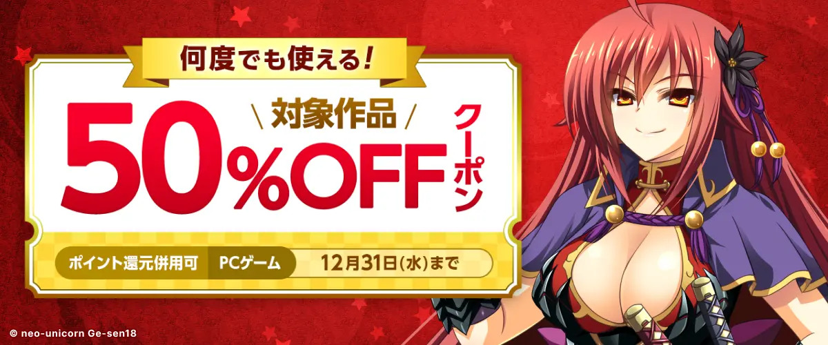有名タイトルが999本も多数対象となっている「【PCゲーム】何度でも使える対象作品50%OFFクーポン」が配布中だ。ポイント還元も併用可能なので有効に活用しよう。期間は12月31日いっぱいまでとなっている。