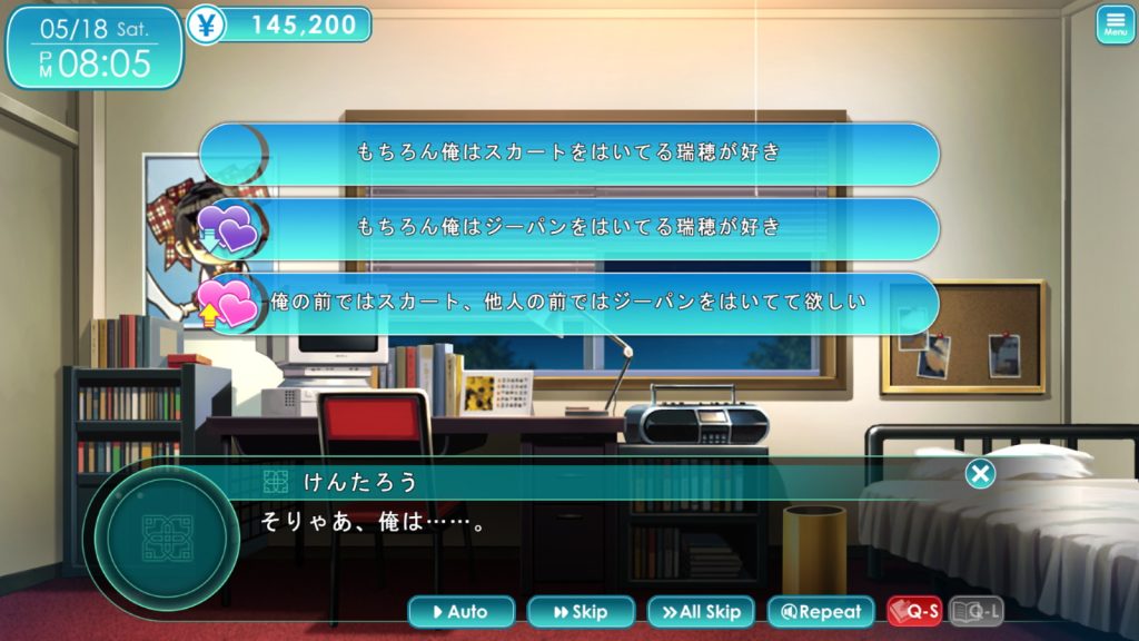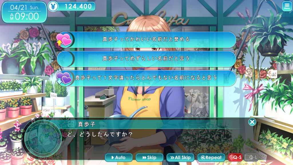 ヒントモードをONにすると、ADVパートでマップのどこに誰が現れるかが可視化されるほか、ヒロインとの会話時に好感度が上がる選択肢がわかり、所持金が無限になるといった恩恵が受けられる。