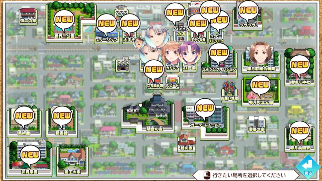 ▲ADVパートでは卯月学園内や卯月町のマップを自由に探索できる