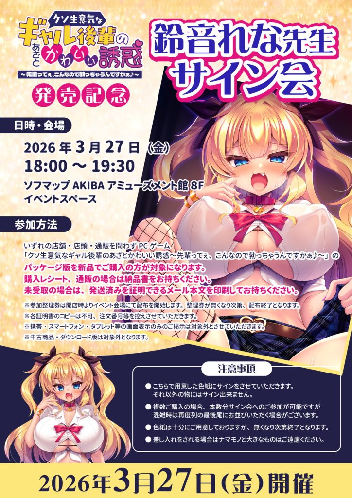 『クソ生意気なギャル後輩のあざとかわいい誘惑 ~先輩ってぇ、こんなので勃っちゃうんですかぁ♪~』の発売を記念した原画家サイン会が、2026年3月27日(金)18時より、ソフマップAKIBAアミューズメント館の特設イベントスペースにて開催される。