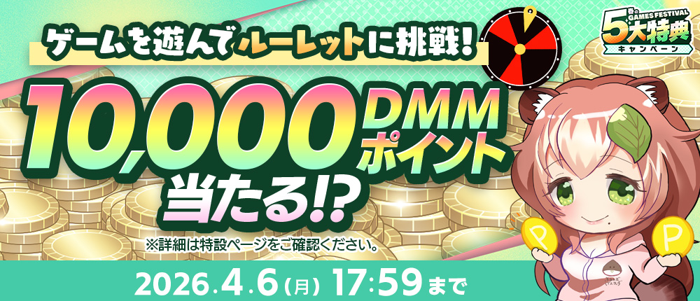 そのほか毎日最大1万DMMポイントが当たるルーレットや、約1万円相当のゲーム内アイテム配布、ポイント消費で10%還元抽選など、5つのキャンペーンが同時開催される。