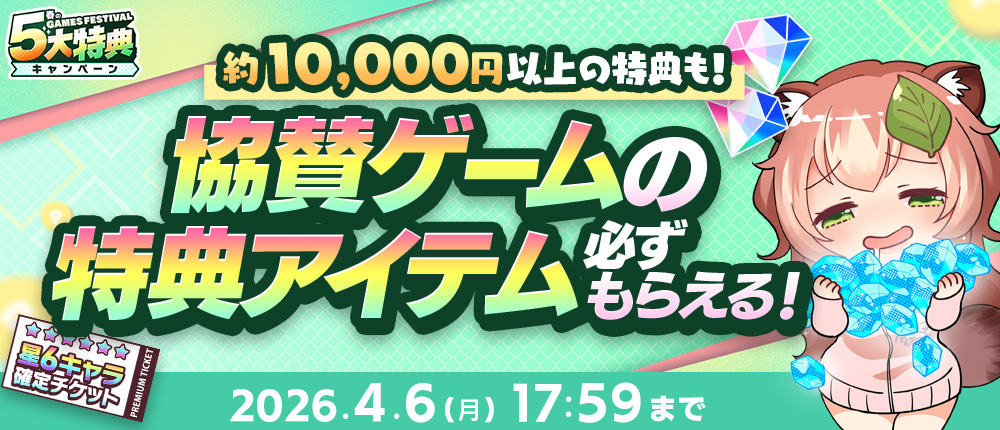 期間中、協賛ゲームをプレイするとプレイしたゲーム内で使える「10連ガチャチケット」や「レアキャラ確定チケット」など、豪華特典アイテムをもれなくプレゼントします。