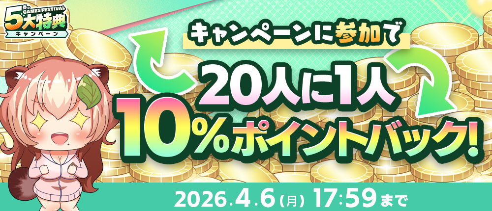 期間中、キャンペーンに参加してFANZA GAMESでDMMポイントを消費すると、抽選で20人に1人へ10%分のポイントが還元されます。