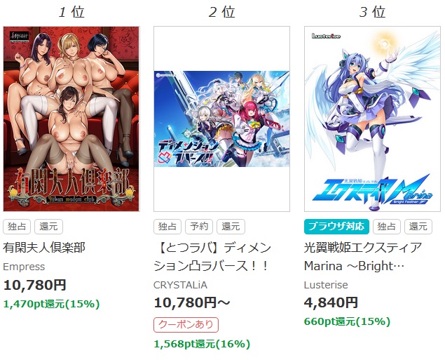 FANZA GAMESにおける3月の月間ダウンロードランキング首位は、3月27日から配信されているEmpressの新作『有閑夫人倶楽部』が獲得した。同級生の母親と関係を持ったことを皮切りに、背徳的な世界へと堕ちてゆく主人公の姿が描かれる。